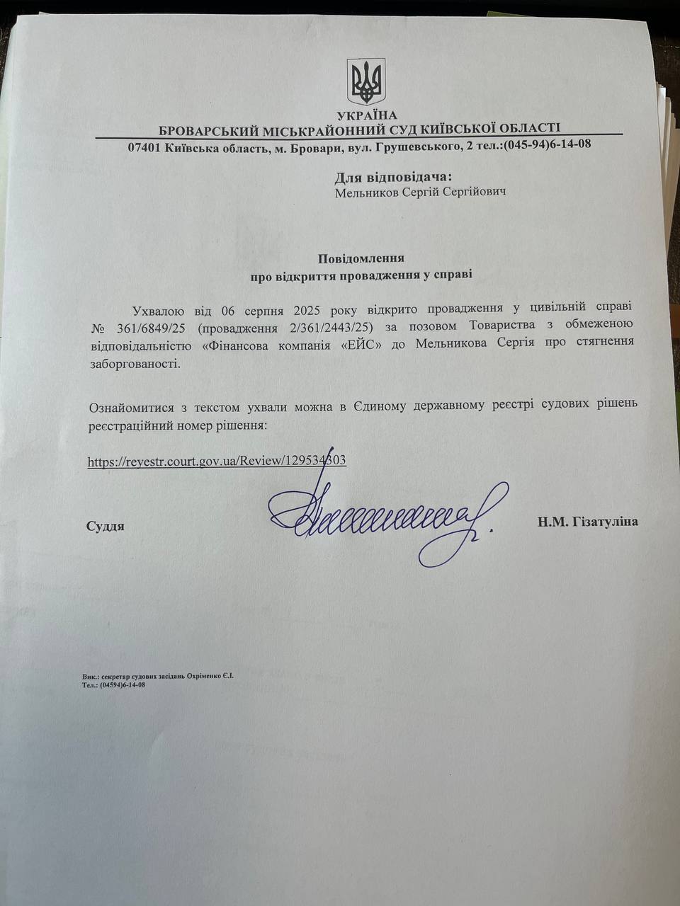 Повідомлення про відкриття провадження у справі 361/6849/25