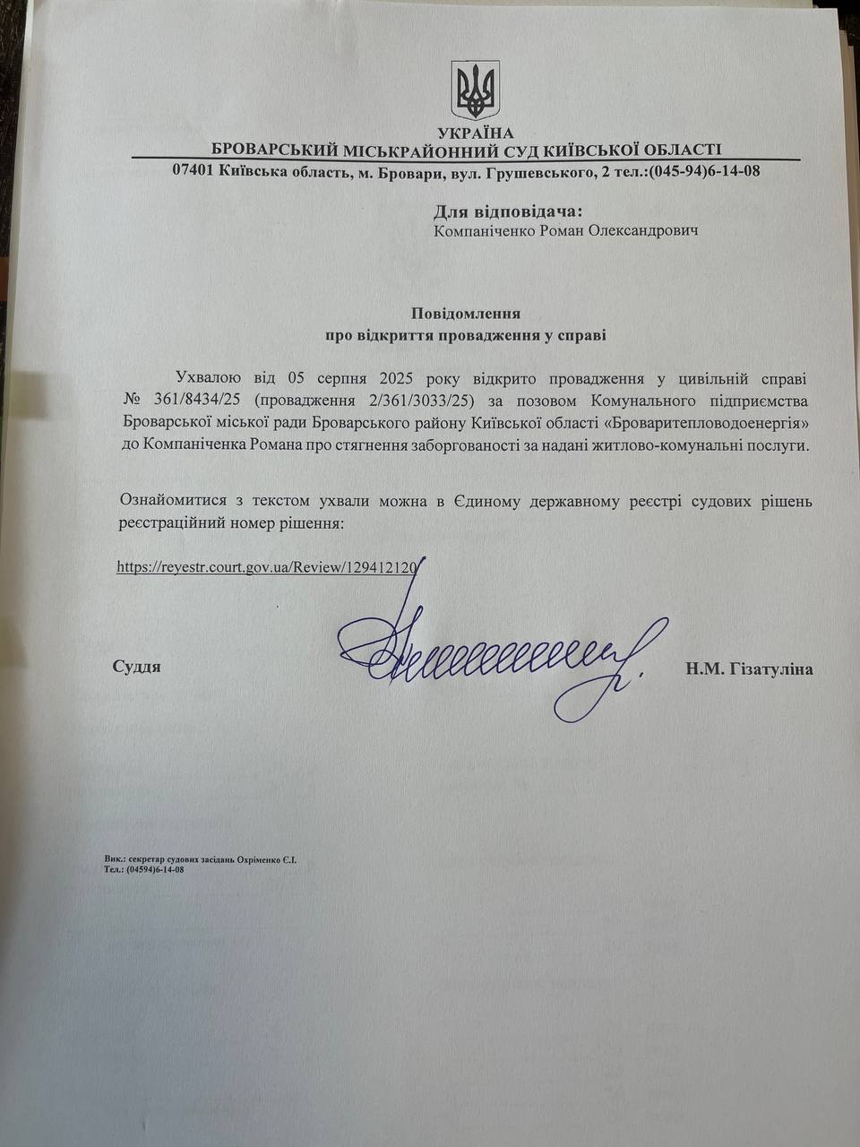 Повідомлення про відкриття провадження у справі 361/8434/25