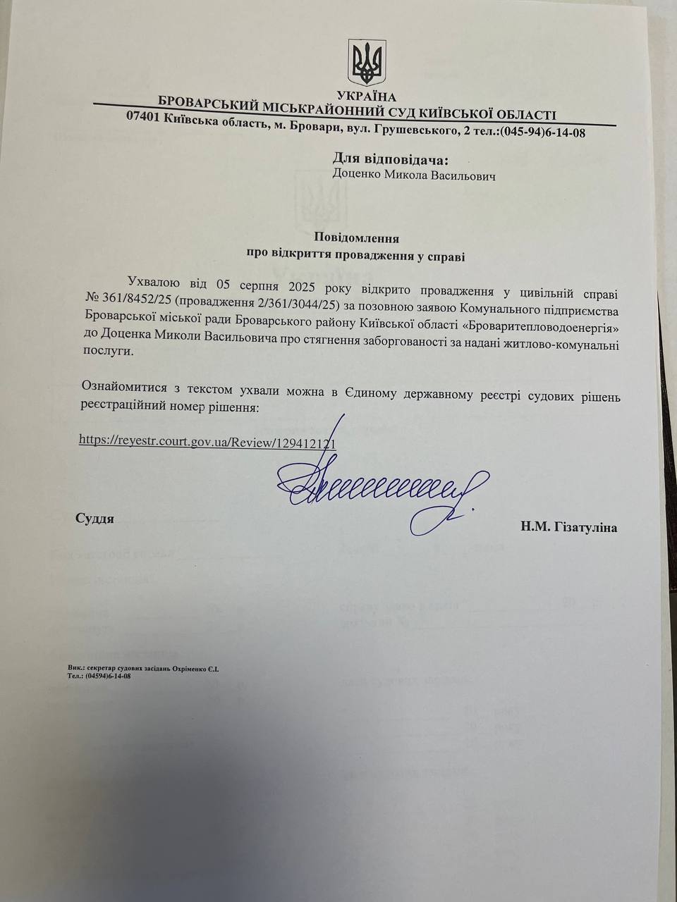 Повідомлення про відкриття провадження у справі 361/8452/25
