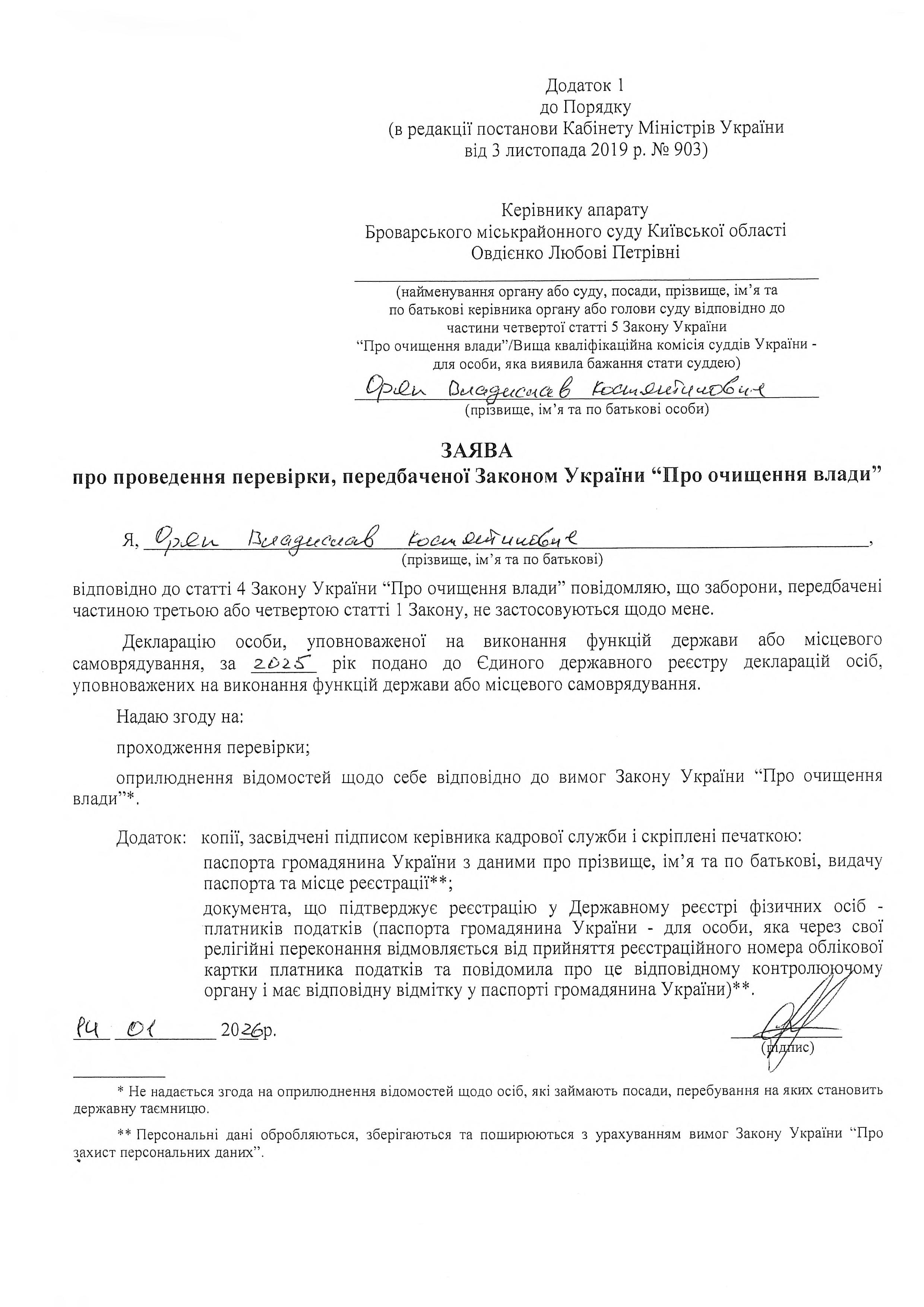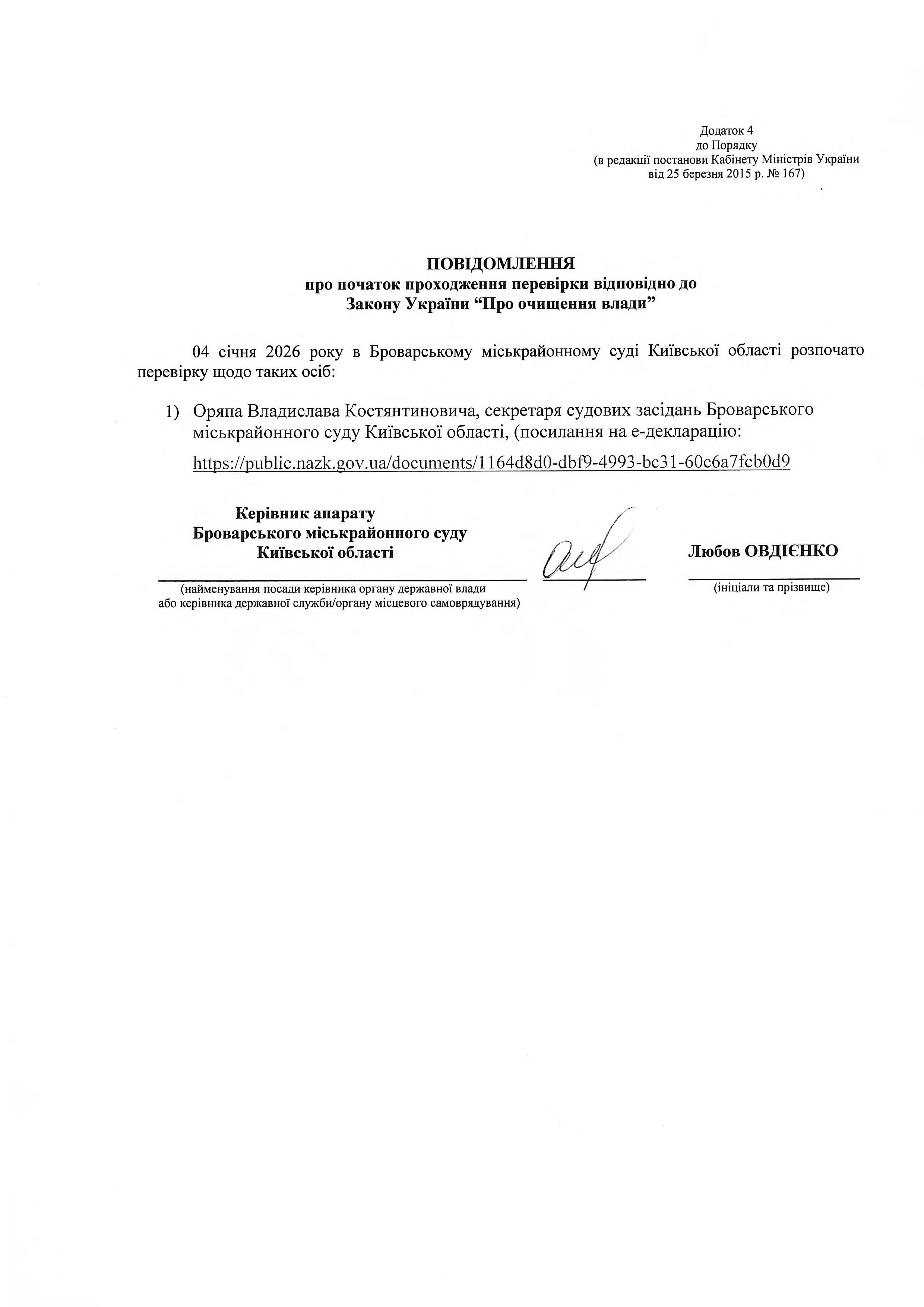 Повідомлення про проведення перевірки відповідно до ЗУ "Про очищення влади" відносно Оряпа В.К.