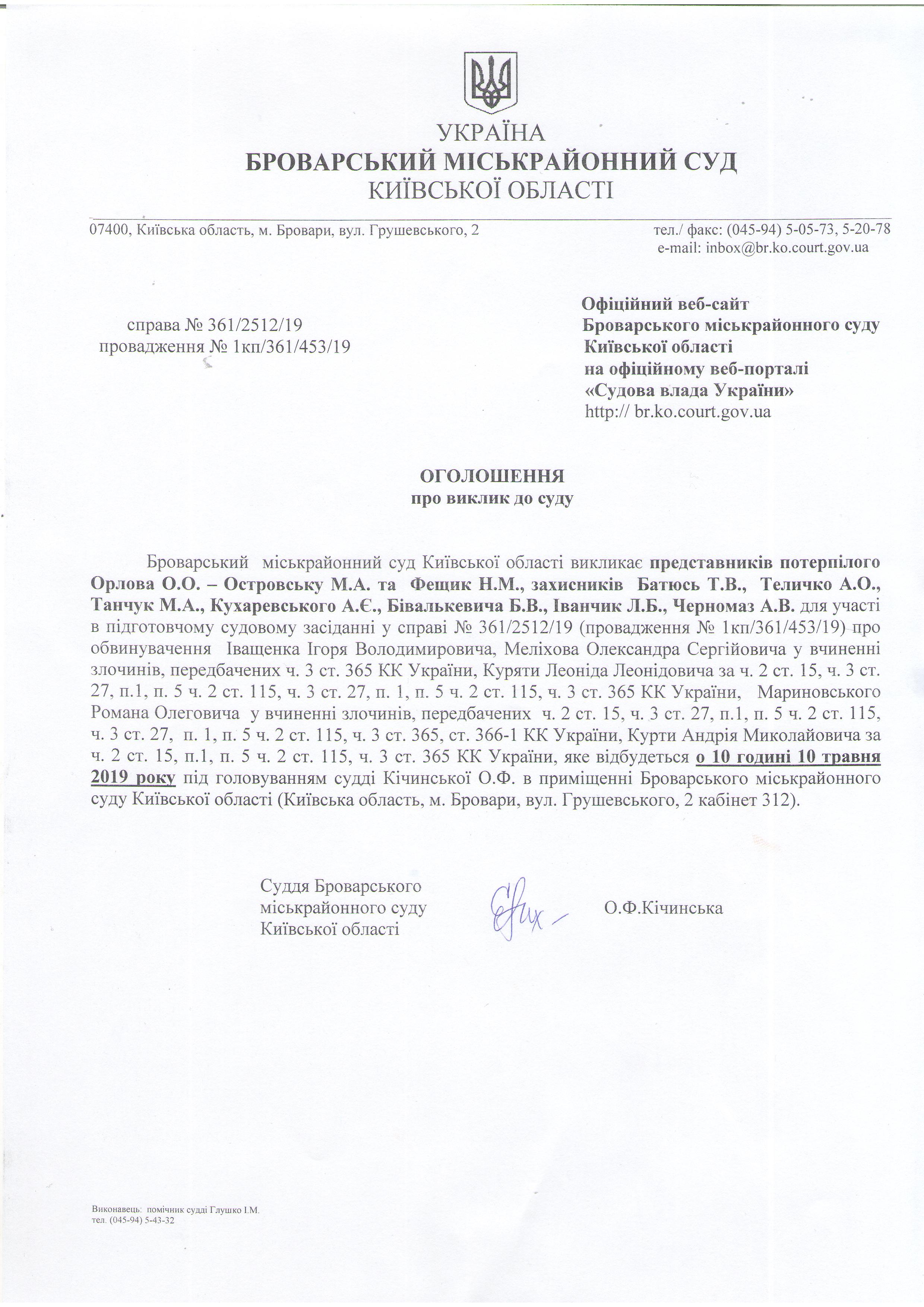 Броварський міськрайонний суд Київської області викликає представників потерпілого Орлова О.О. – Островську М.А. та Фещик Н.М., захисників Батюсь Т.В., Теличко А.О., Танчук М.А., Кухаревського А.Є., Бівалькевича Б.В., Іванчик Л.Б., Черномаз А.В.