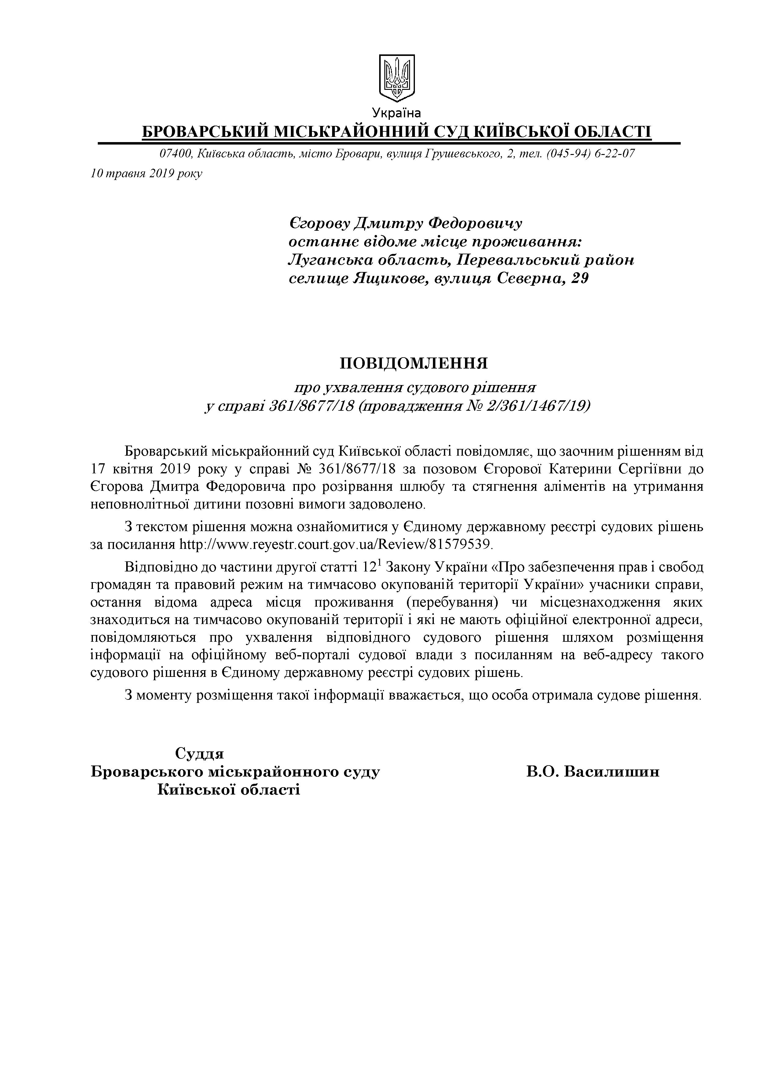ПОВІДОМЛЕННЯ про ухвалення судового рішення у справі 361/8677/18 (провадження № 2/361/1467/19)