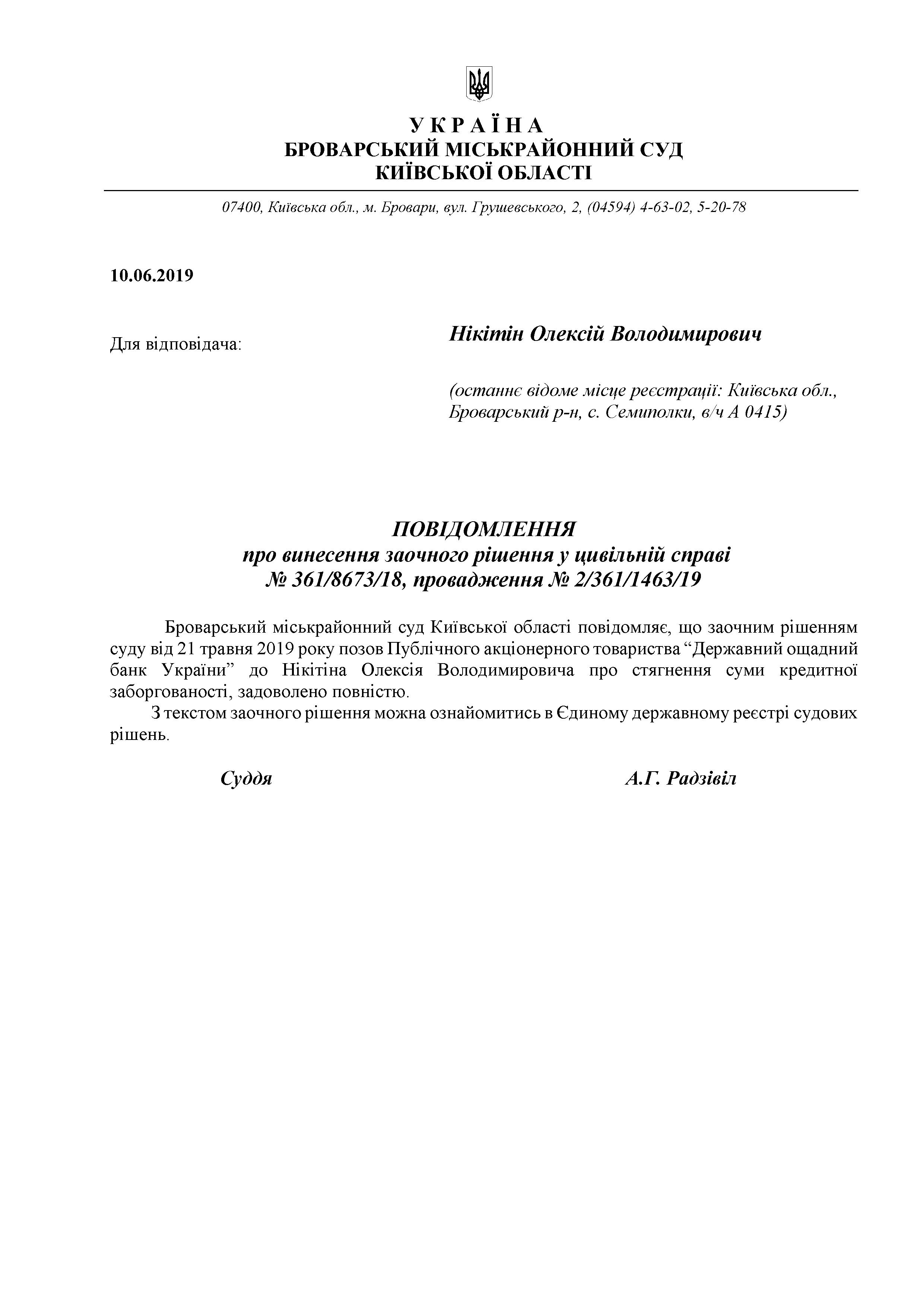 ПОВІДОМЛЕННЯ про винесення заочного рішення у цивільній справі № 361/8673/18, провадження № 2/361/1463/19