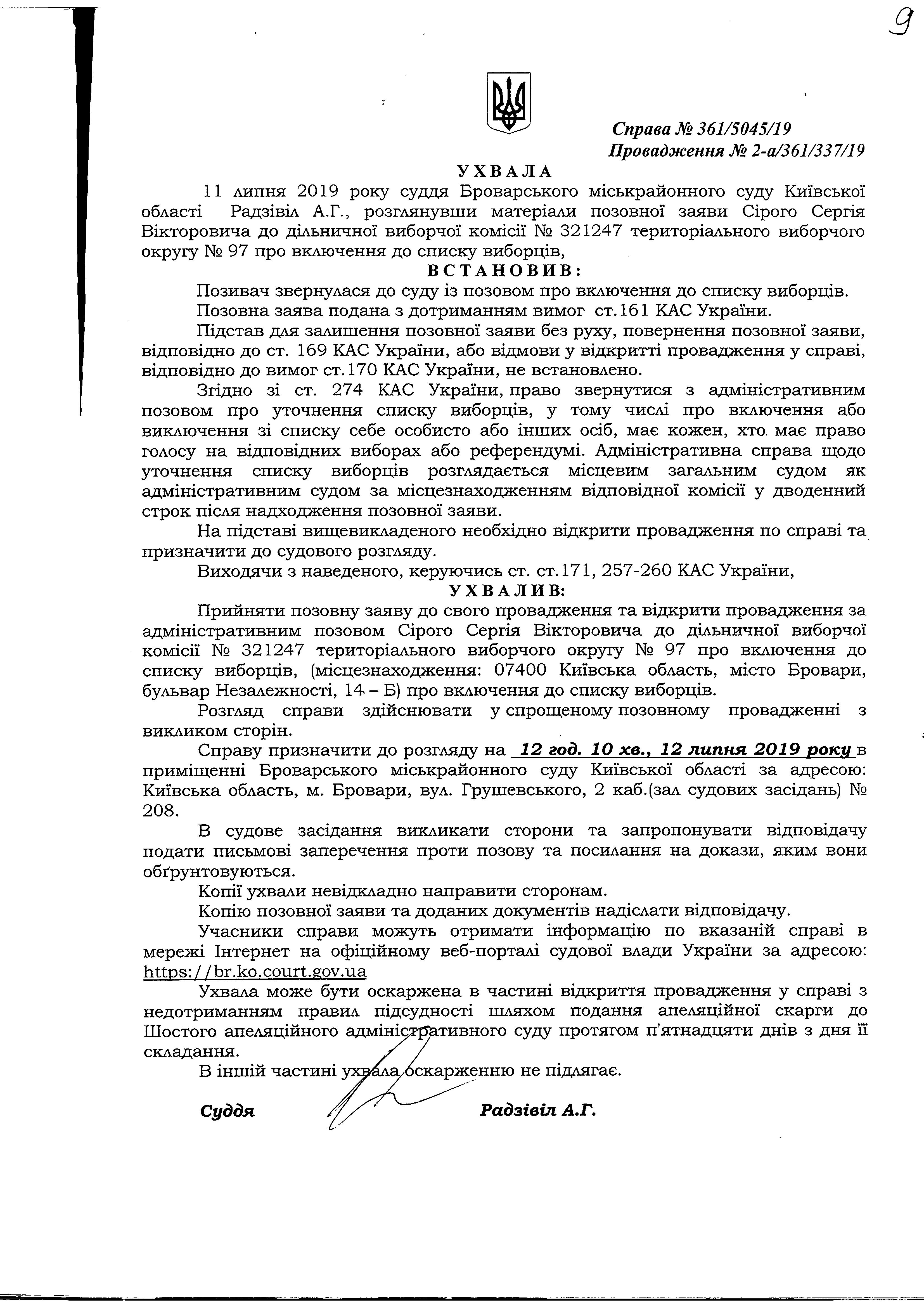 Ухвала про відкриття провадження за адміністративним позовом Сірого С.В. до дільничої виборчої комісії № 321247
