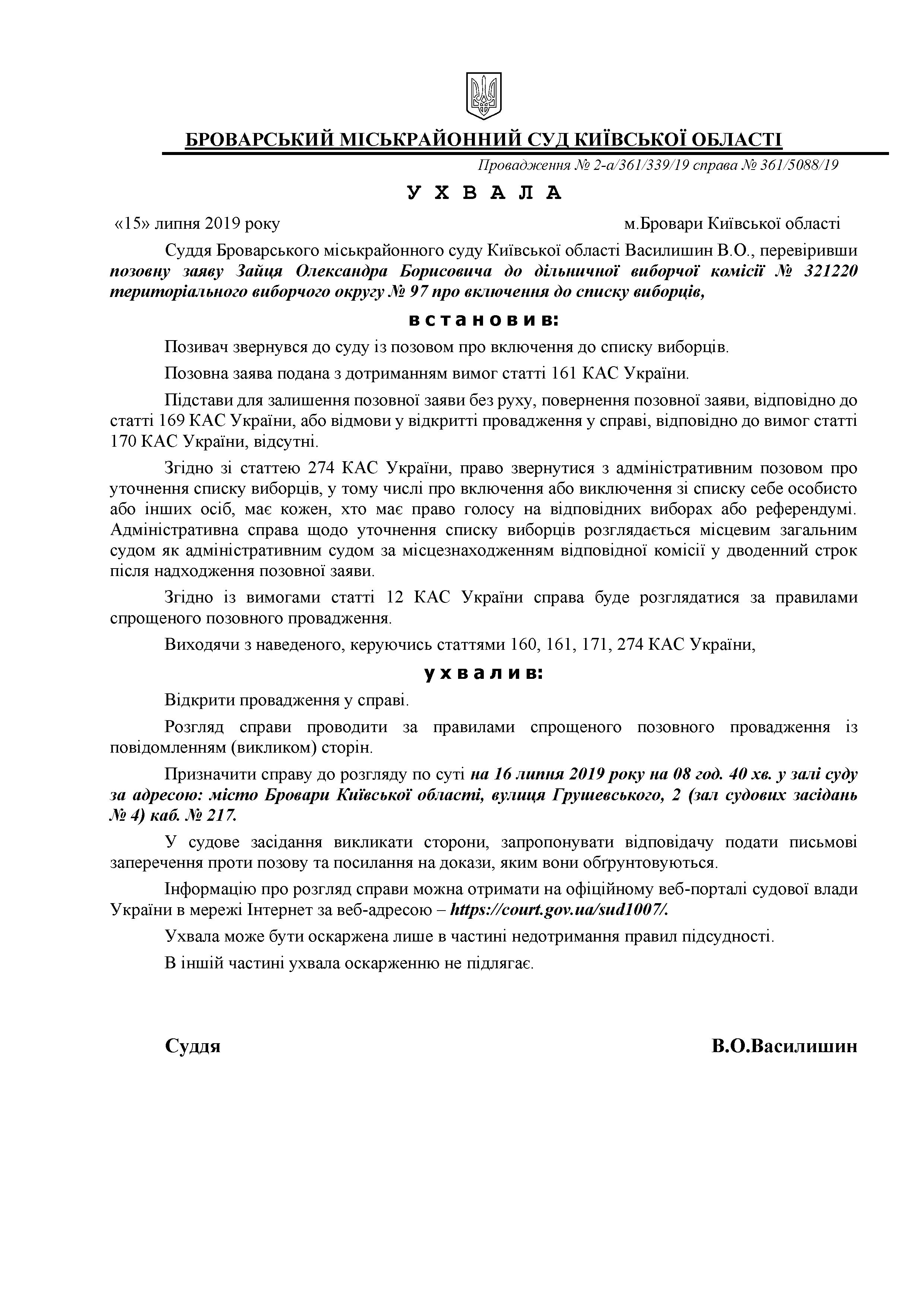 Ухвала про відкриття провадження за адміністративним позовом Зайця Олександра Борисовича до дільничної виборчої комісії № 321220 територіального виборчого округу № 97 про включення до списку виборців