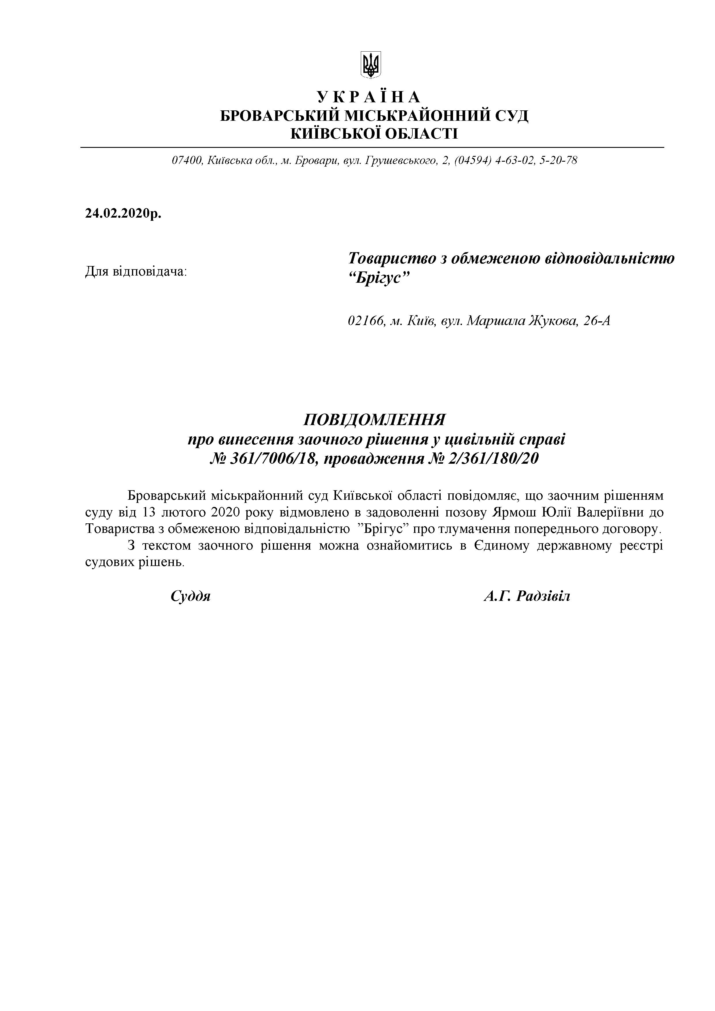 ПОВІДОМЛЕННЯ про винесення заочного рішення у цивільній справі № 361/7006/18, провадження № 2/361/180/20