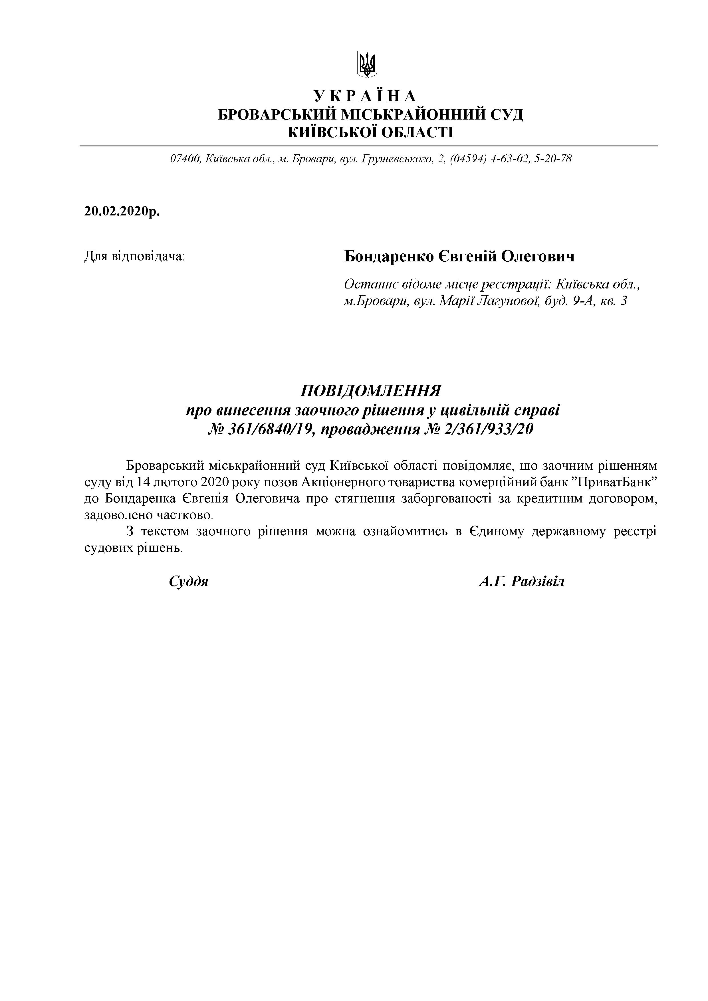 ПОВІДОМЛЕННЯ про винесення заочного рішення у цивільній справі № 361/6840/19, провадження № 2/361/933/20