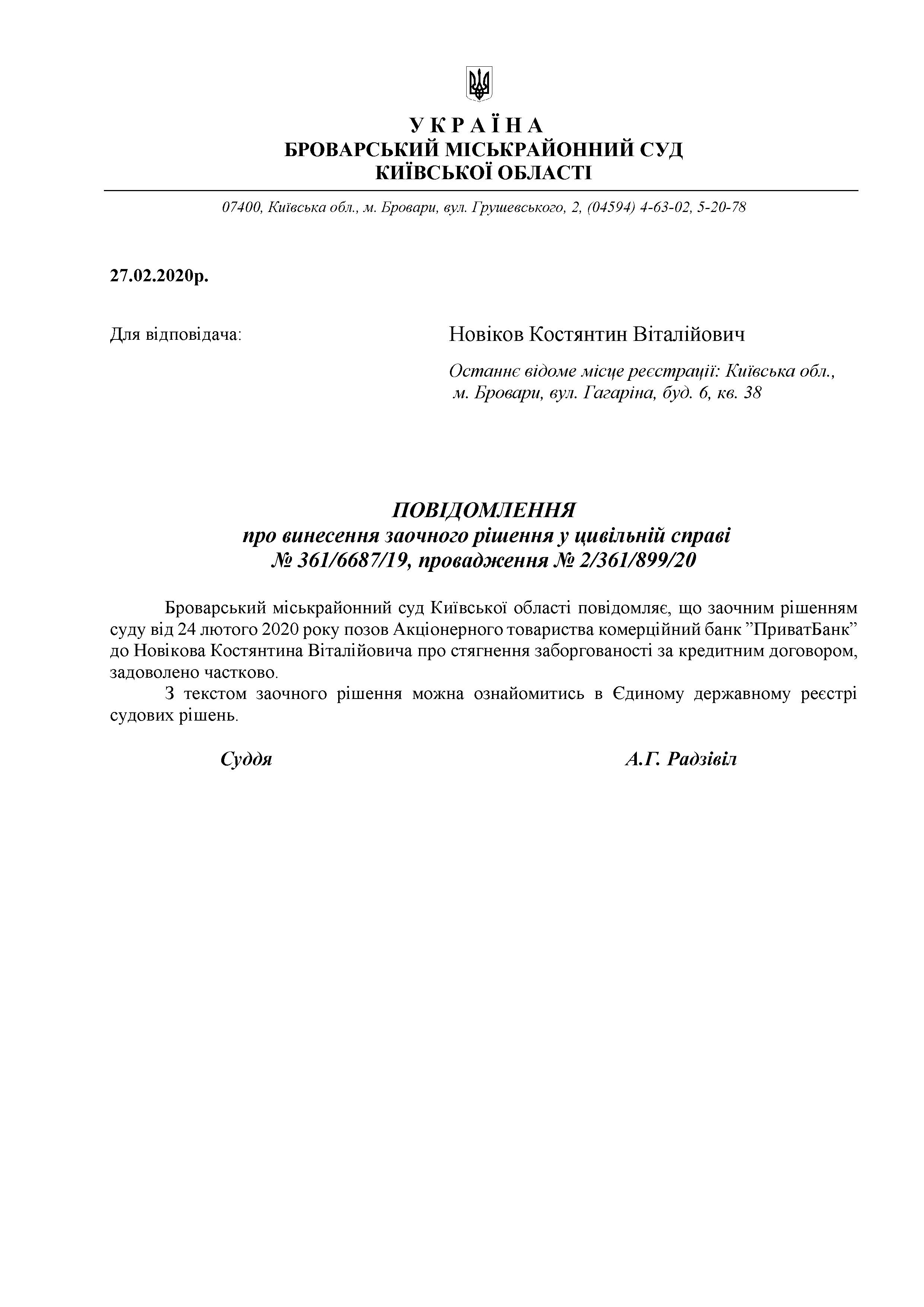 ПОВІДОМЛЕННЯ про винесення заочного рішення у цивільній справі № 361/6687/19, пр
